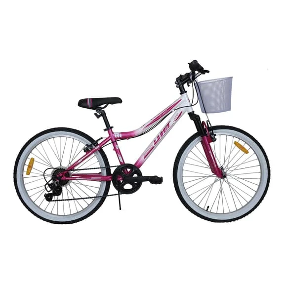 La bicicletta Umit 24″ Diana per bambine dai 9 ai 12 anni e con altezza da 135 cm a 150 cm, con cambio Shimano a 6×3 velocità, sospensione anteriore, pneumatici bicolore da 24×2,125, cerchi in alluminio, robusto telaio in acciaio Hi Ten, con campanello e luci riflettenti per la visibilità, cavalletto e cestino in metallo.