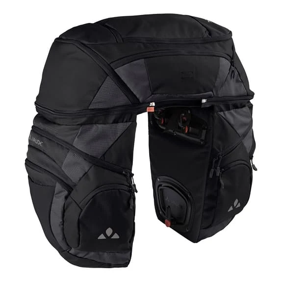 Le borse posteriori Vaude Karakorum Pro, con una capacità di 65 litri, sono progettate come una borsa tripla ad alta capacità per il turismo in bicicletta. Presentano due scomparti principali su ogni lato, con uno scomparto superiore divisibile in 2 parti, e anche utilizzabile come zaino. Include una moltitudine di scomparti extra per aiutarti a organizzare bene il tuo bagaglio. Include il sistema di fissaggio QMR 2.0, adattabile a tubi fino a 16 mm di diametro con chiave. È realizzato tramite il processo Eco Finish, libero da fluorocarbonati, privo di PFC e idrorepellente. L’etichetta Vaude Green Shape è sinonimo di articoli ecologici e funzionali realizzati con materiali eco sostenibili.