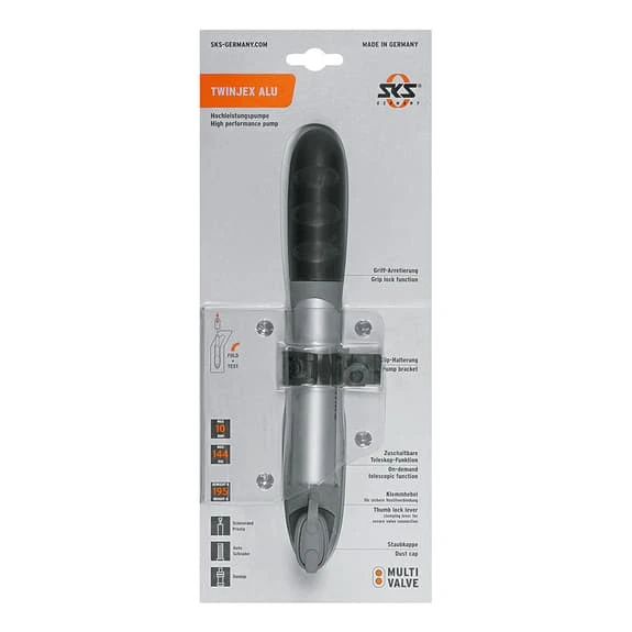 La pompa manuale SKS Twinjex Alu è una pompa MTB compatta di livello superiore con una testa a valvole multiple per tutti i tipi di valvole. Il volume massimo per colpo rende Injex la scelta corretta per i ciclisti di montagna. I tasselli di gomma offrono la massima comodità e presa. Pompa telescopica che permette un rendimento massimo di 140 PSI grazie alla modalità alta pressione (blocco della bacchetta esterna).