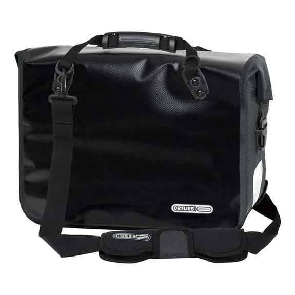 Tracolla Ortlieb Office-Bag 21L e con adattatore Quick-Lock2.1 può essere fissata sulla destra o sulla sinistra del portapacchi e può essere agganciata o rilasciata molto velocemente. Grazie alla tracolla imbottita smontabile, puoi portarla con te quando lasci la bici parcheggiata ed entri in ufficio. Presenta due inserti riflettenti realizzati in materiale Scotchlite da 3M’ che garantiscono una buona visibilità in condizioni di luce sfavorevoli e al buio. Presenta un sistema di chiusura a rotolo e il suo interno è ben strutturato come l’esterno. Offre uno scomparto imbottito per notebook fino a 15.4 pollici, spazio sufficiente per due cartelle DIN A4, penne, cellulare e altro ancora. Questa tracolla è realizzata in poliestere rivestito con PU (poliuretano) e senza PVC (cloruro di polivinile), ottenendo un materiale robusto e impermeabile in tela che offre una grande qualità, una lunghissima durata e rispetta l’ambiente.
